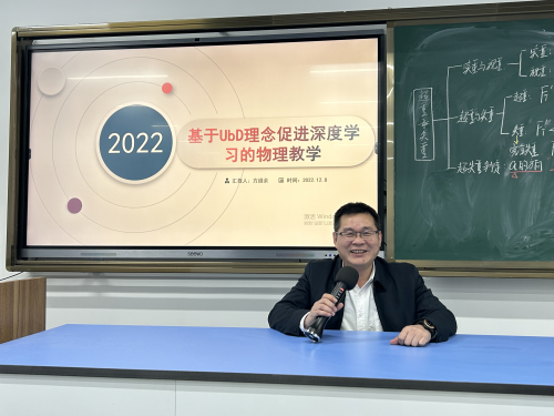 本次活动特邀特级、正高级教师方道余做专业的指导和引领。方道余老师为我们带来了《基于UbD理念促进深度学习的高中物理教学》的讲座,分别从核心素养与深度学习的认识、UbD理念的教学设计模式、教学设计的实践案例三个方面来讲述,强调了以核心素养为纲、以深度学习为方法的重要性。